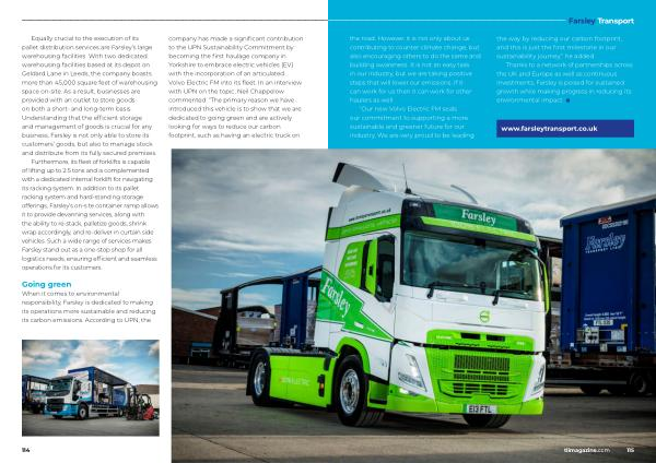Furthermore , its fleet of forklifts is capable of lifting up to 2.5 tons and is complemented with a dedicated internal forklift for navigating its racking system . In addition to its pallet racking system and hard-standing storage offerings , Farsley ’ s on-site container ramp allows it to provide devanning services , along with the ability to re-stack , palletize goods , shrink wrap accordingly , and re-deliver in curtain side vehicles . Such a wide range of services makes Farsley stand out as a one-stop shop for all logistics needs , ensuring efficient and seamless operations for its customers . company has made a significant contribution to the UPN Sustainability Commitment by becoming the first haulage company in Yorkshire to embrace electric vehicles ( EV ) with the incorporation of an articulated Volvo Electric FM into its fleet . In an interview with UPN on the topic , Neil Chappelow commented : “ The primary reason we have introduced this vehicle is to show that we are dedicated to going green and are actively looking for ways to reduce our carbon footprint , such as having an electric truck on