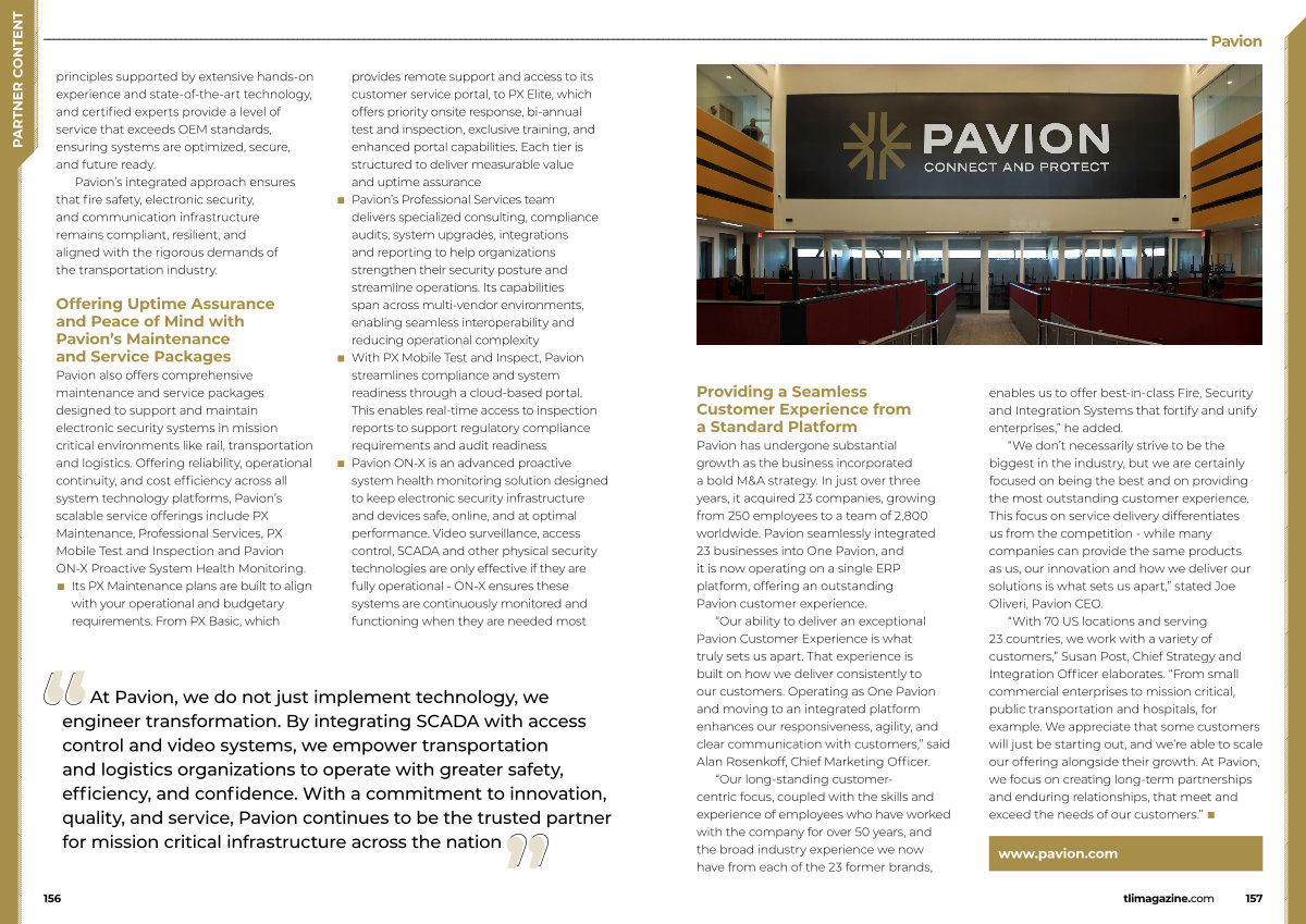 Pavion also offers comprehensive maintenance and service packages designed to support and maintain electronic security systems in mission critical environments like rail, transportation and logistics. Offering reliability, operational continuity, and cost efficiency across all system technology platforms, Pavion’ s scalable service offerings include PX Maintenance, Professional Services, PX Mobile Test and Inspection and Pavion ON-X Proactive System Health Monitoring.