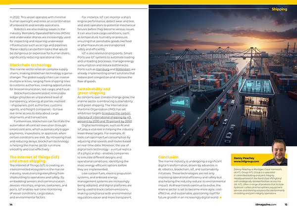 The marine industry is undergoing a significant digital transformation, driven by advances in AI, robotics, blockchain, IoT, and sustainability initiatives. These technologies are not only improving operational efficiency and safety but also helping the industry reduce its environmental impact. As these trends continue to evolve, the marine sector is set to become more agile, costeffective, and sustainable, positioning itself for future growth in an increasingly digital world. ■