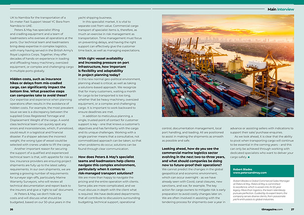 How does Peters & May’ s specialist teams and loadmasters help clients navigate this complex environment, particularly when it comes to risk-managed transport solutions? We are more than happy to navigate the pricing and the entire operation with clients. Some jobs are more complicated, and we must discuss in depth with the client what is required. We have dedicated departments that all contribute to discussions surrounding budgeting, technical support, operational