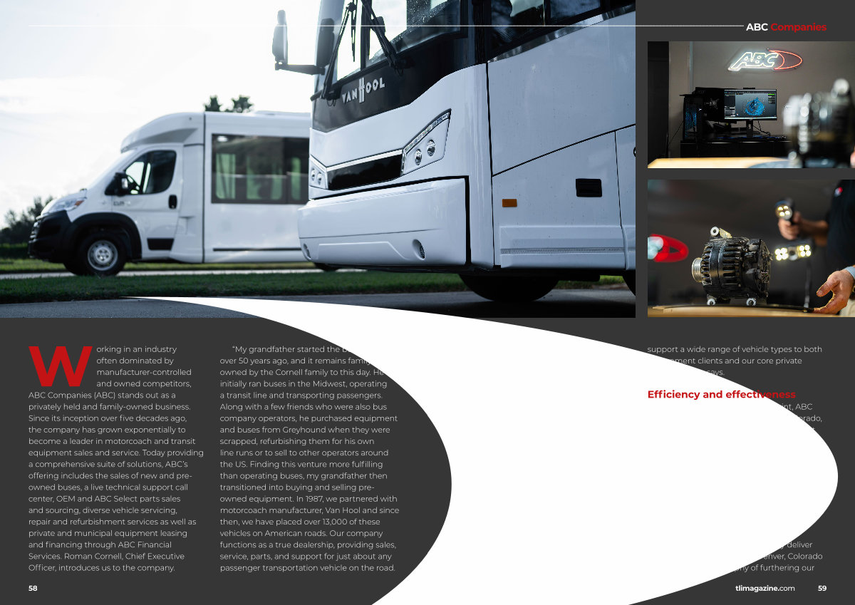 Working in an industry often dominated by manufacturer-controlled and owned competitors, ABC Companies( ABC) stands out as a privately held and family-owned business. Since its inception over five decades ago, the company has grown exponentially to become a leader in motorcoach and transit equipment sales and service. Today providing a comprehensive suite of solutions, ABC’ s offering includes the sales of new and preowned buses, a live technical support call center, OEM and ABC Select parts sales and sourcing, diverse vehicle servicing, repair and refurbishment services as well as private and municipal equipment leasing and financing through ABC Financial Services. Roman Cornell, Chief Executive Officer, introduces us to the company.