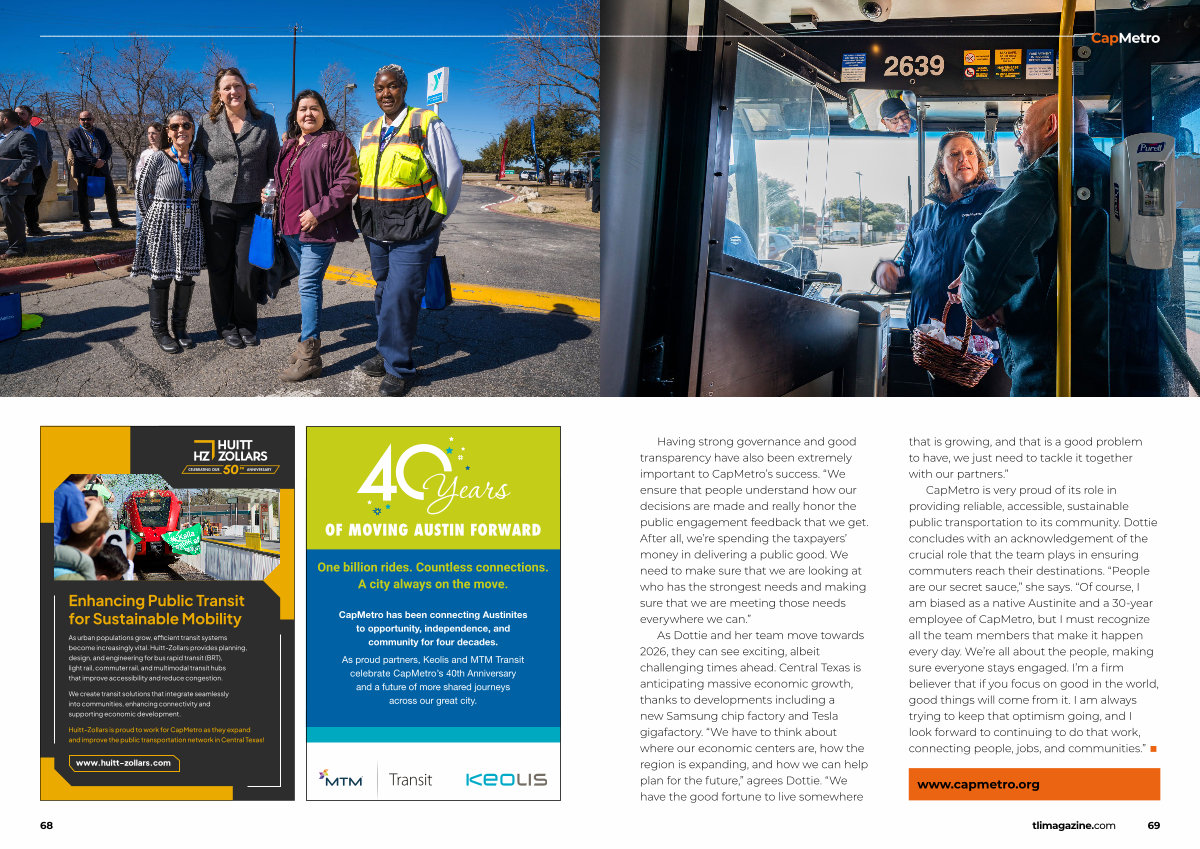 CapMetro is very proud of its role in providing reliable, accessible, sustainable public transportation to its community. Dottie concludes with an acknowledgement of the crucial role that the team plays in ensuring commuters reach their destinations.“ People are our secret sauce,” she says.“ Of course, I am biased as a native Austinite and a 30-year employee of CapMetro, but I must recognize all the team members that make it happen every day. We’ re all about the people, making sure everyone stays engaged. I’ m a firm believer that if you focus on good in the world, good things will come from it. I am always trying to keep that optimism going, and I look forward to continuing to do that work, connecting people, jobs, and communities.” ■