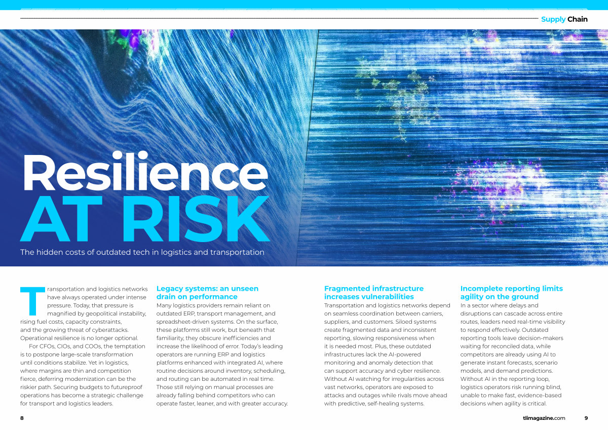 Transportation and logistics networks depend on seamless coordination between carriers, suppliers, and customers. Siloed systems create fragmented data and inconsistent reporting, slowing responsiveness when it is needed most. Plus, these outdated infrastructures lack the AI-powered monitoring and anomaly detection that can support accuracy and cyber resilience. Without AI watching for irregularities across vast networks, operators are exposed to attacks and outages while rivals move ahead with predictive, self-healing systems.