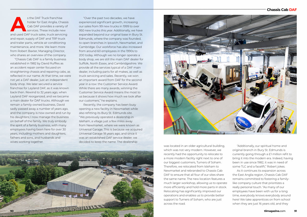 “ Chassis Cab DAF is a family business established in 1982 by David Ruffles as an accident repair center focused on straightening chassis and repairing cabs, as reflected in our name. At that time, we were not yet a DAF dealer, just an independent body shop. We later secured a service franchise for Leyland DAF, as it was known back then. Rewind to 32 years ago, when Leyland DAF reorganized, and we became a main dealer for DAF trucks. Although we remain a family-owned business, David sadly passed away a number of years ago, and the company is now owned and run by his daughters; I now manage the business on behalf of the family. We truly embody the spirit of a family business, with many employees having been here for over 30 years, including mothers and daughters, fathers and sons, and husbands and wives working together.