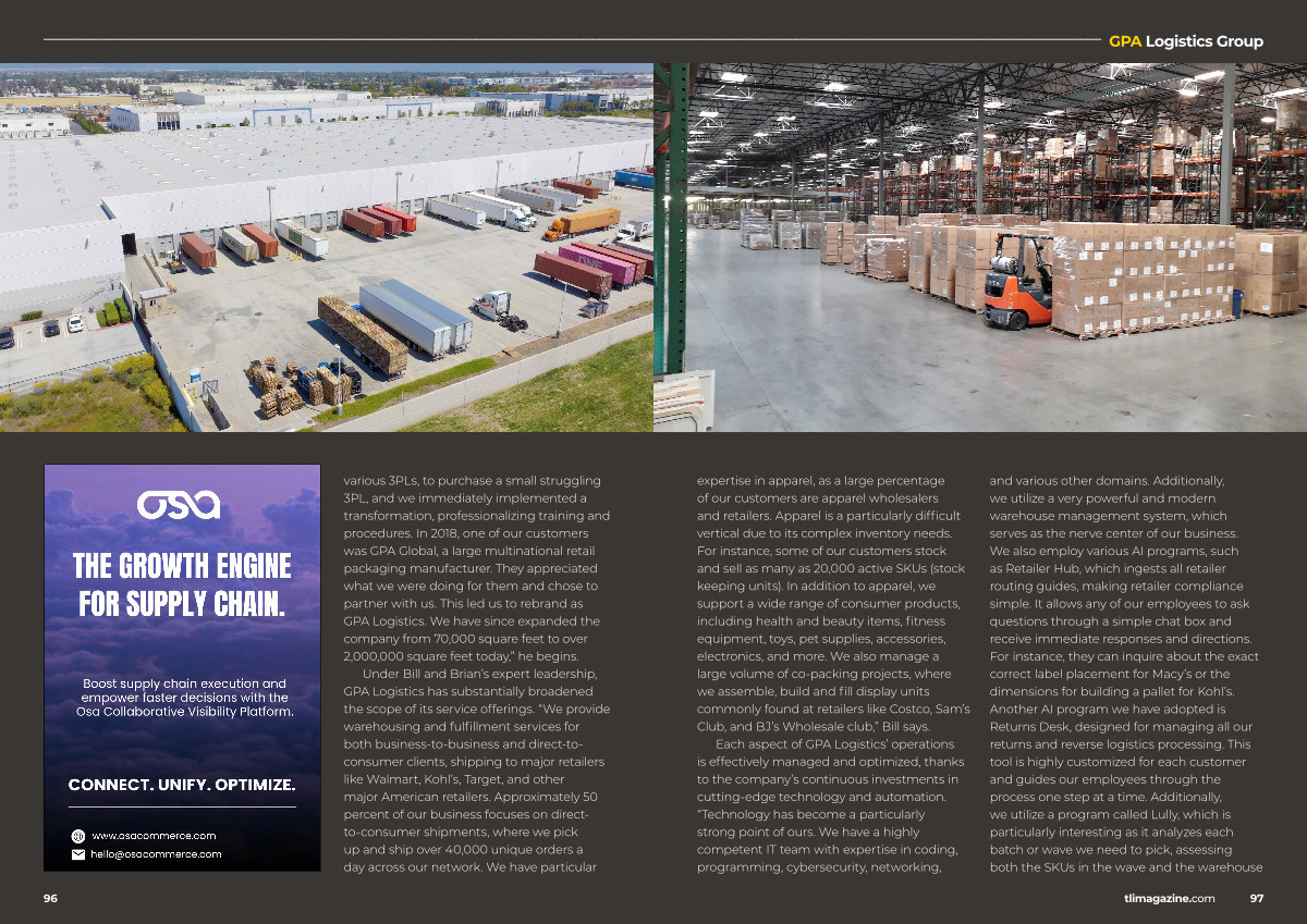 Under Bill and Brian’ s expert leadership, GPA Logistics has substantially broadened the scope of its service offerings.“ We provide warehousing and fulfillment services for both business-to-business and direct-toconsumer clients, shipping to major retailers like Walmart, Kohl’ s, Target, and other major American retailers. Approximately 50 percent of our business focuses on directto-consumer shipments, where we pick up and ship over 40,000 unique orders a day across our network. We have particular
