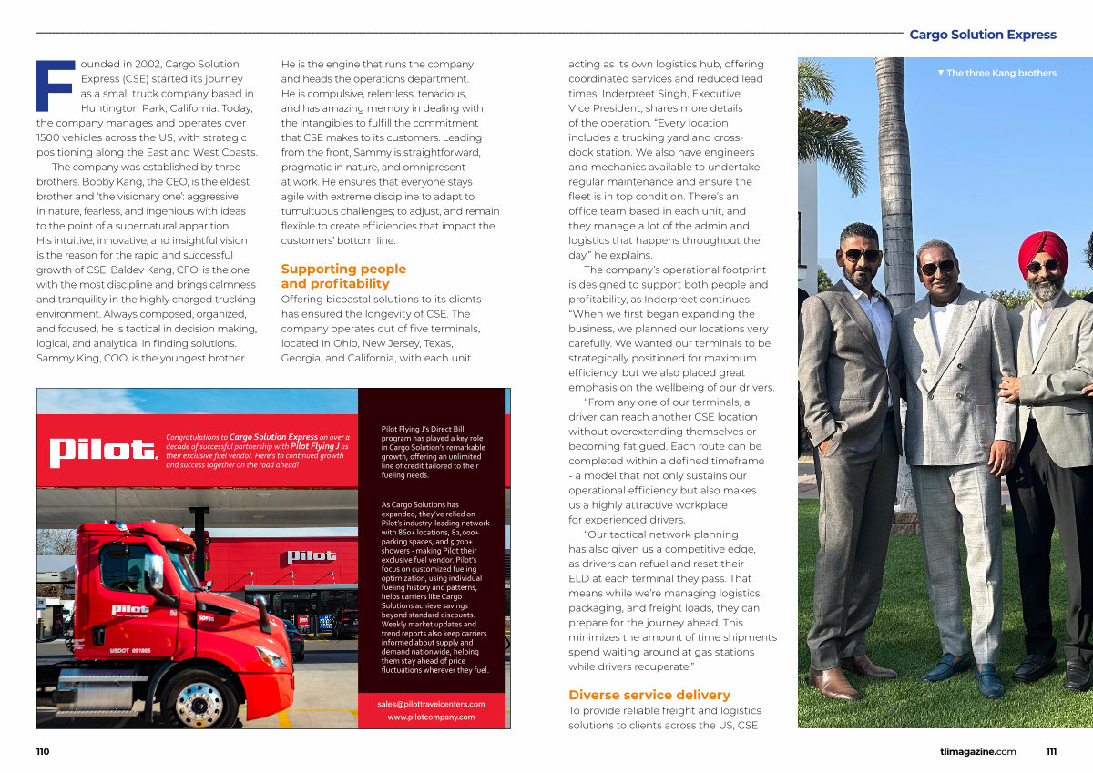Founded in 2002, Cargo Solution Express( CSE) started its journey as a small truck company based in Huntington Park, California. Today, the company manages and operates over 1500 vehicles across the US, with strategic positioning along the East and West Coasts. The company was established by three brothers. Bobby Kang, the CEO, is the eldest brother and‘ the visionary one’: aggressive in nature, fearless, and ingenious with ideas to the point of a supernatural apparition. His intuitive, innovative, and insightful vision is the reason for the rapid and successful growth of CSE. Baldev Kang, CFO, is the one with the most discipline and brings calmness and tranquility in the highly charged trucking environment. Always composed, organized, and focused, he is tactical in decision making, logical, and analytical in finding solutions. Sammy King, COO, is the youngest brother.