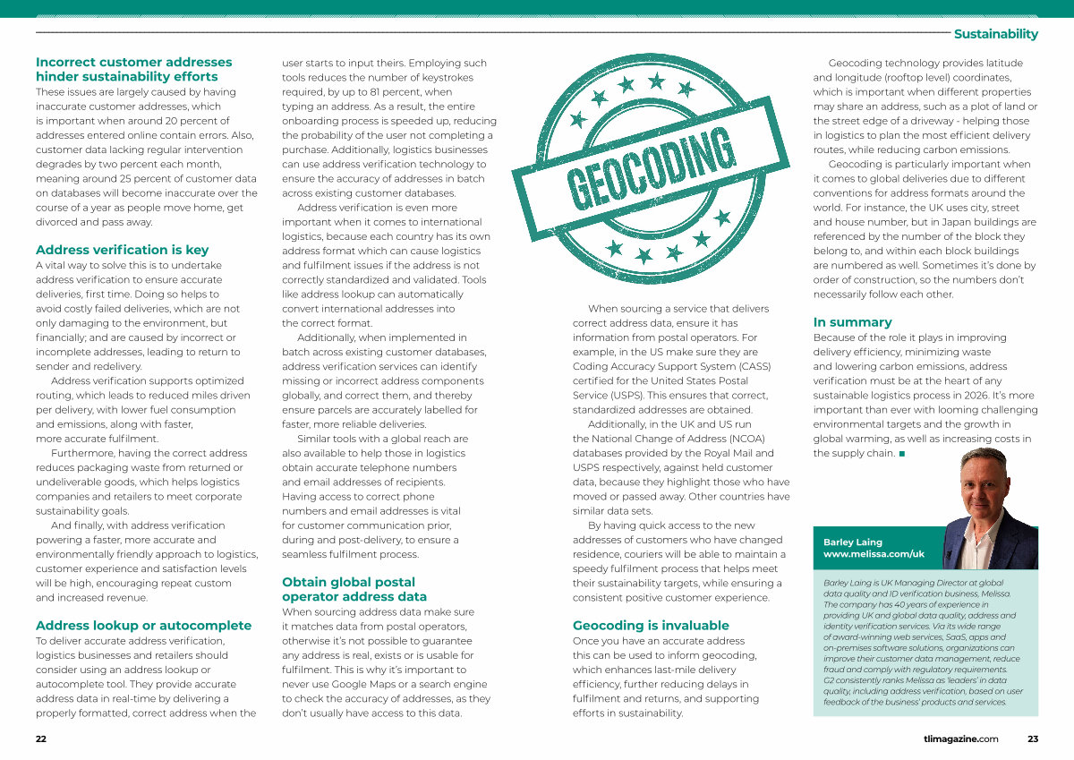 Because of the role it plays in improving delivery efficiency, minimizing waste and lowering carbon emissions, address verification must be at the heart of any sustainable logistics process in 2026. It’ s more important than ever with looming challenging environmental targets and the growth in global warming, as well as increasing costs in the supply chain. ■