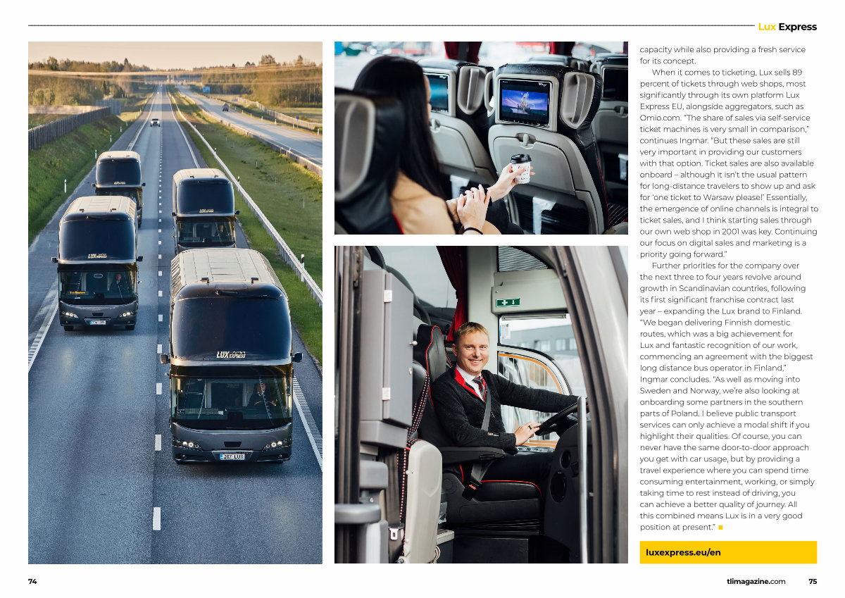 Further priorities for the company over the next three to four years revolve around growth in Scandinavian countries, following its first significant franchise contract last year – expanding the Lux brand to Finland.“ We began delivering Finnish domestic routes, which was a big achievement for Lux and fantastic recognition of our work, commencing an agreement with the biggest long distance bus operator in Finland,” Ingmar concludes.“ As well as moving into Sweden and Norway, we’ re also looking at onboarding some partners in the southern parts of Poland. I believe public transport services can only achieve a modal shift if you highlight their qualities. Of course, you can never have the same door-to-door approach you get with car usage, but by providing a travel experience where you can spend time consuming entertainment, working, or simply taking time to rest instead of driving, you can achieve a better quality of journey. All this combined means Lux is in a very good position at present.” ■