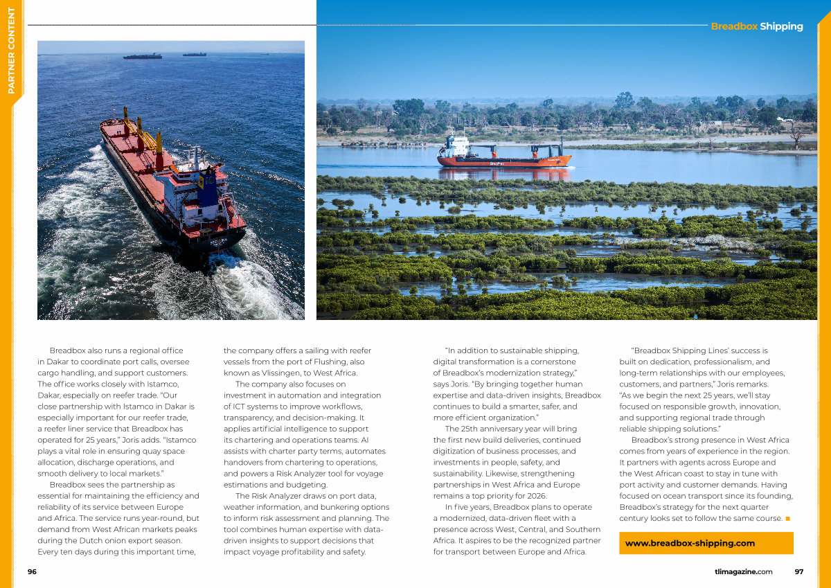 Breadbox’ s strong presence in West Africa comes from years of experience in the region. It partners with agents across Europe and the West African coast to stay in tune with port activity and customer demands. Having focused on ocean transport since its founding, Breadbox’ s strategy for the next quarter century looks set to follow the same course. ■